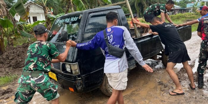 Satgas TMMD Terjun Bantu Warga yang Mobilnya Tersangkut di Jalan Berlumpur