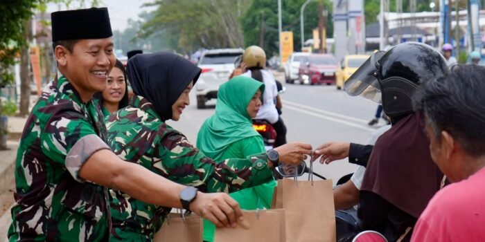 KUTAI TIMUR – Personel Koramil 0909-01/Sangatta jajaran Kodim 0909/Kutai Timur membagikan takjil kepada para pengguna jalan di wilayah Sangatta, Kabupaten Kutai Timur,
