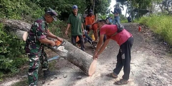 SABANG – Hujan yang disertai angin menyebabkan sebuah pohon tumbang dan menutup akses jalan di Jurong Ilham Syukuran, Gampong Krueng Raya, Kecamatan