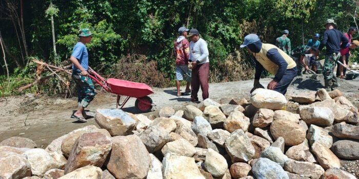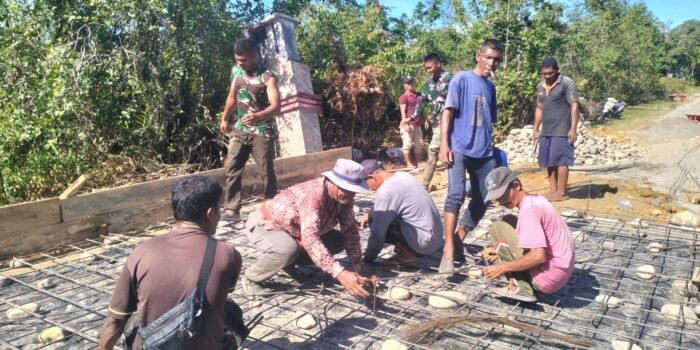 ACEH SELATAN – Sinergi antara TNI dan masyarakat terus terlihat dalam pembangunan Jembatan Aramco di Desa Pasi Rasian, Kecamatan Pasi Raja. Hari