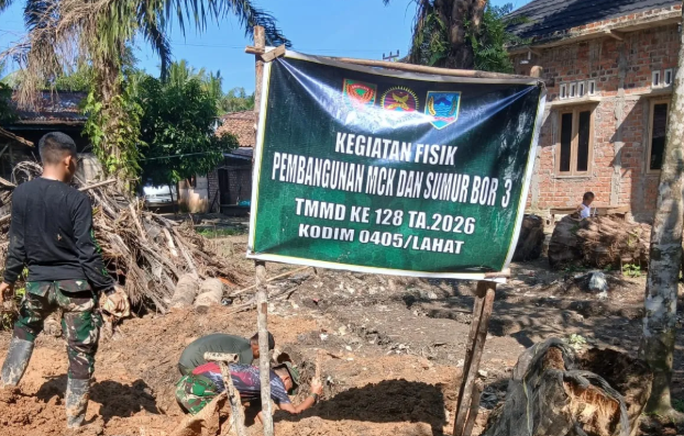 Lahat — Aksi cepat ditunjukkan oleh Satgas TNI Manunggal Membangun Desa (TMMD) ke-128 Kodim 0405/Lahat dalam merealisasikan infrastruktur untuk masyarakat. Setelah berhasil menemukan sumber air bersih melalui metode pengeboran, pembangunan sarana mandi, cuci, kakus (MCK) pun segera dilaksanakan di Desa Lubuk Tampang, Kecamatan Kikim Timur, Kabupaten Lahat.