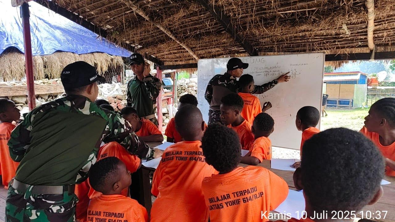TOLIKARA – Personel Pos Kanggime Satgas Yonif 614/RJP pedulian terhadap pendidikan anak-anak di Distrik Kanggime dengan mengajarkan membaca, menulis, dan berhitung (calistung) kepada anak-anak Kampung Kanggime, Distrik Kanggime, Kabupaten Tolikara, Papua Pegunungan. Kegiatan ini dilakukan sebagai upaya mencerdaskan generasi penerus bangsa, Kamis (10/7/2025).