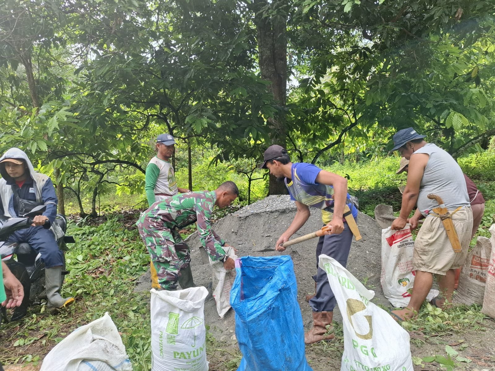 Kodim Poso, – Sertu Nasib Rakmin, anggota Koramil 1307-01/Poso Kota, bersama warga setempat melaksanakan kerja bakti pengecoran jalan kantong produksi di wilayah RT 3, Dusun 2, Desa Labuan, Kecamatan Lage, Kabupaten Poso. Selasa, (11/2/2025).