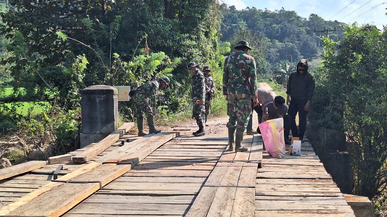 Konawe – Anggota TNI dan Polri yang tergabung dalam Satgas TMMD (TNI Manunggal Membangun Desa) 125 Kodim 1417/Kendari sedang melakukan pemasangan papan roda pada jembatan, di Desa Awua Jaya, Kec. Asinua, Kab. Konawe, Selasa (29/7).