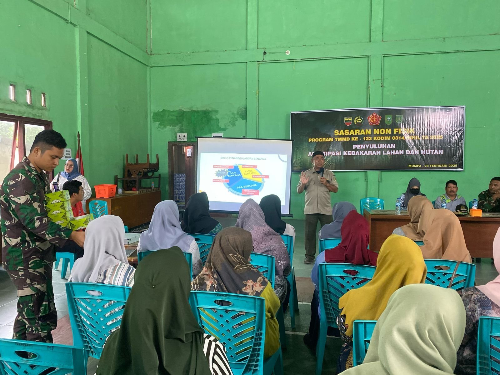 INHIL – Warga Desa Mumpa, Kecamatan Tempuling, menunjukkan antusiasme tinggi saat mengikuti penyuluhan pencegahan kebakaran hutan dan lahan (Karhutla) yang digelar Kodim 0314/Inhil dalam rangka program non fisik TNI Manunggal Membangun Desa (TMMD) ke-123, Jumat (28/2/2025).