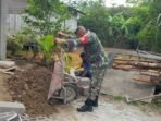 ACEH BARAT – Babinsa Koramil 02/Woyla Kodim 0105/Aceh Barat, Serda Bigges Saragih, melaksanakan Binter dengan membantu mengaduk campuran semen untuk dinding rumah