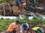 ACEH SELATAN – Personel TNI bersama masyarakat terus menunjukkan semangat gotong royong dalam melanjutkan proses pembangunan Jembatan Aramco di Desa Pasi Rasian,