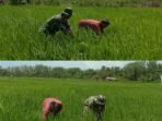Babinsa Koramil 09/Samatiga Sertu Buchari Muslim Bantu Petani Bersihkan Hama Rumput di Lahan Padi