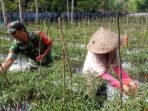 ACEH JAYA — Babinsa Koramil 01/Jaya Kodim 0114/Aceh Jaya, Koptu Aris Kartiko, membantu Bu Saidah memanen cabai merah di Desa Meutara, Kecamatan