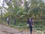 ACEH BARAT – Babinsa Koramil 03/Kaway XVI Kodim 0105/Abar, Sertu Anton, membantu warga membersihkan ruas jalan di Desa Beuregang, Kecamatan Kaway XVI,