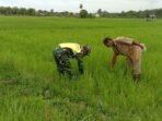 ACEH BARAT – Babinsa Koramil 03 Kaway XVI Kodim 0105 Abar, Serma Usman, melaksanakan kegiatan pengecekan dan pemantauan perkembangan padi bersama warga