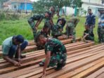 KUTAI TIMUR – Di bawah langit Desa Suka Rahmat yang cerah, beberapa prajurit TNI tampak membungkuk, fokus mengukur kayu balok dengan seksama.