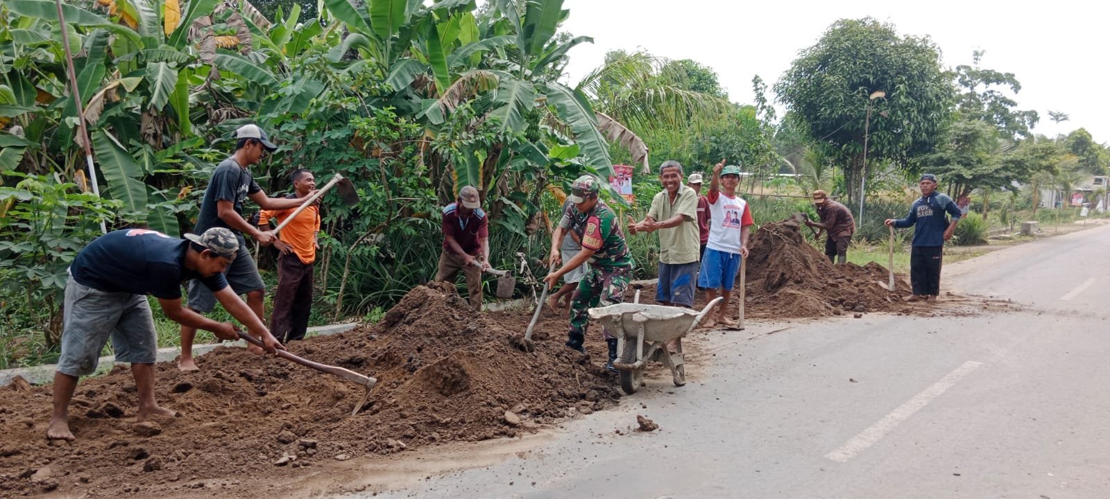 Banjar Agung (Tulang Bawang) — Babinsa Koramil 426-04/Banjar Agung, Kodim 0426 Tulang Bawang, Pelda Sukardi bersama warga Kampung Tri Tunggal Jaya melaksanakan kegiatan gotong royong melaksanakan penimbunan bahu jalan di Desa Tri Tunggal Jaya Kecamatan Banjar Agung, Kabupaten Tulang Bawang, Sabtu 11 Januari 2025.
