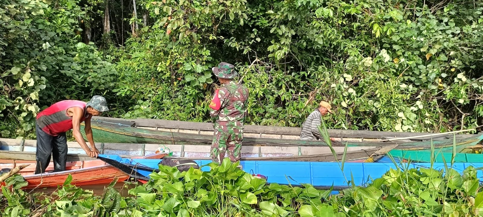 Kegiatan tersebut dilakukan dengan menyusuri aliran sungai menggunakan perahu kecil bermesin yang oleh warga setempat biasa disebut ketinting. Bersama masyarakat, para Babinsa memotong ranting, membersihkan semak belukar, serta menyingkirkan tanaman liar yang menghambat jalur transportasi air.