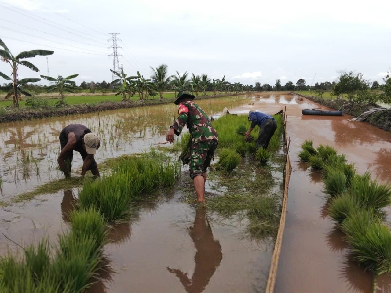 Di tengah hamparan sawah yang tergenang air, Serda Baihaqi tampak berbaur dengan para petani, ikut mengikat dan menanam bibit padi dengan penuh semangat. Pendampingan ini tidak hanya bersifat teknis, tetapi juga sebagai bentuk motivasi dan dukungan moral kepada petani agar tetap bersemangat dalam menghadapi musim tanam.