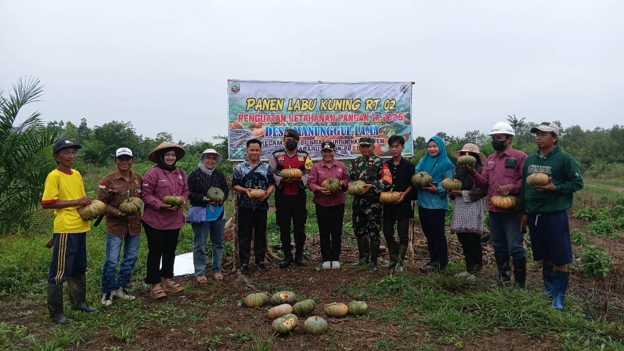 KOTABARU – Babinsa Koramil 1004-09/Sampanahan Kodim 1004/Kotabaru Serka Eko Mujiono membantu petani di desa binaannya yang bernama Sukamto untuk pendampingan perawatan tanaman sampai panen labu di Lahan Perkebunan Desa Manunggul Lama, Kecamatan Sungai Durian, Kamis(28/08/2025)