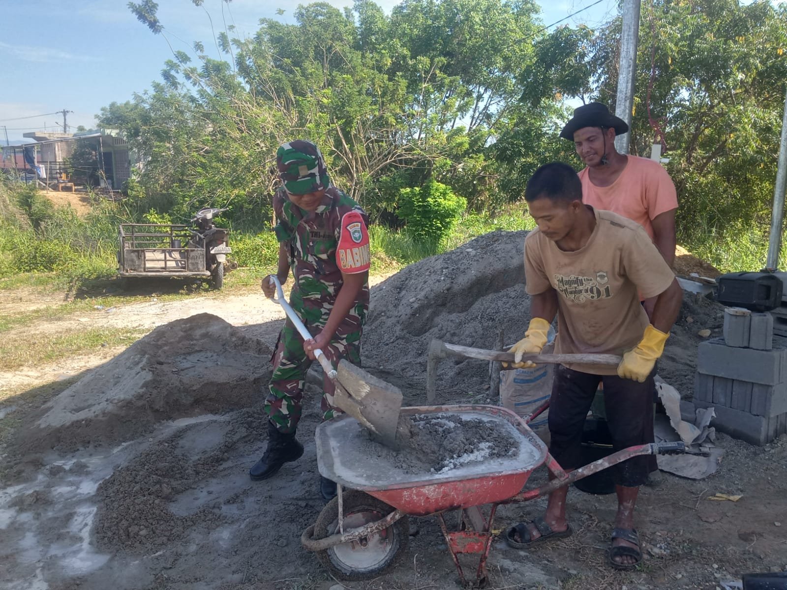 Kehadiran Babinsa di tengah masyarakat tersebut menjadi wujud nyata kepedulian TNI terhadap upaya meningkatkan kesejahteraan warga di wilayah binaan. Dengan semangat gotong royong, Serda Syamsuar bersama warga bergotong royong mengaduk semen dan menuangkannya untuk memperkuat pondasi bangunan kedai.