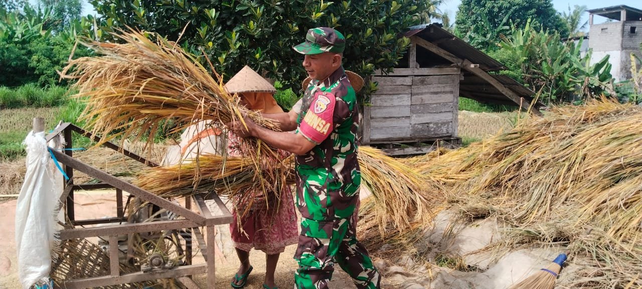 Dompu-NTB. Babinsa Desa Calabai Serka Ilham Koramil 1614-05/Pekat Kodim 1614/Dompu, membantu petani Desa binaannya, merontokkan padi yang sudah dipanen, di lahan persawahan Desa Calabai Kecamatan Pekat Kabupaten Dompu. Sabtu (22/03/2025).