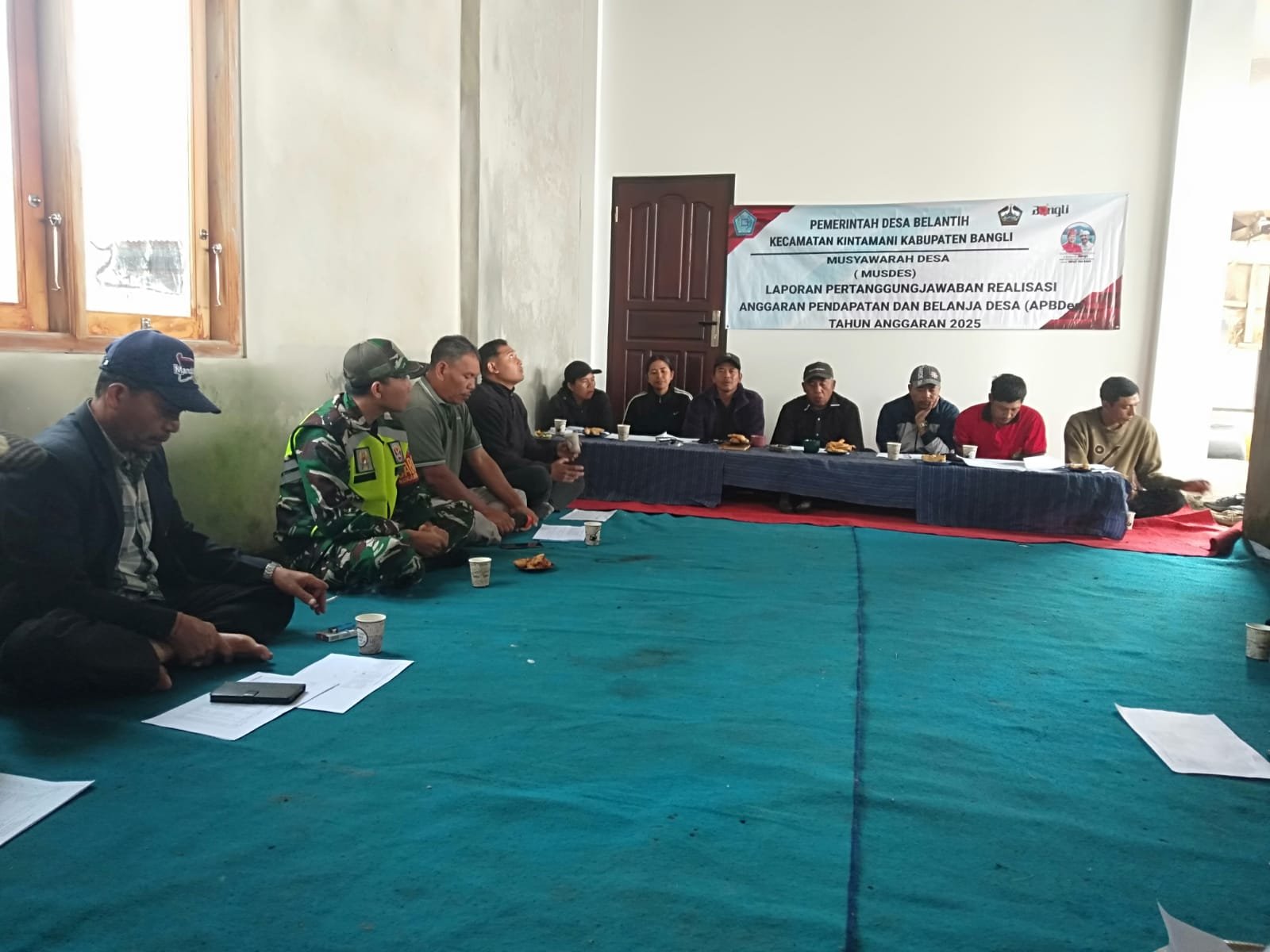 Bangli – Sertu I Made Sukanadi, Babinsa dari Desa Belantih Koramil 1626-04/Kintamani Kodim 1626/Bangli, telah menghadiri Musyawarah Desa (Musdes) yang bertujuan untuk menyampaikan Laporan Pertanggungjawaban Realisasi Anggaran Pendapatan dan Belanja Desa (APBDes) Tahun Anggaran 2025. Kegiatan ini dilaksanakan di Kantor Desa Belantih pada Jumat, 13 Februari 2026.