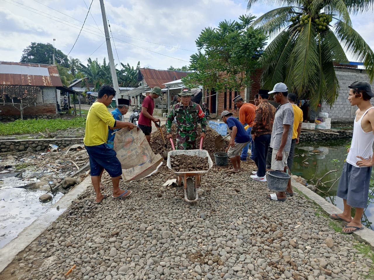 Melihat kondisi Jalan rusak dan membahayakan warga yang melintas, sehingga Babinsa berinisiatif mengajak warga untuk memperbaiki jalan tersebut.