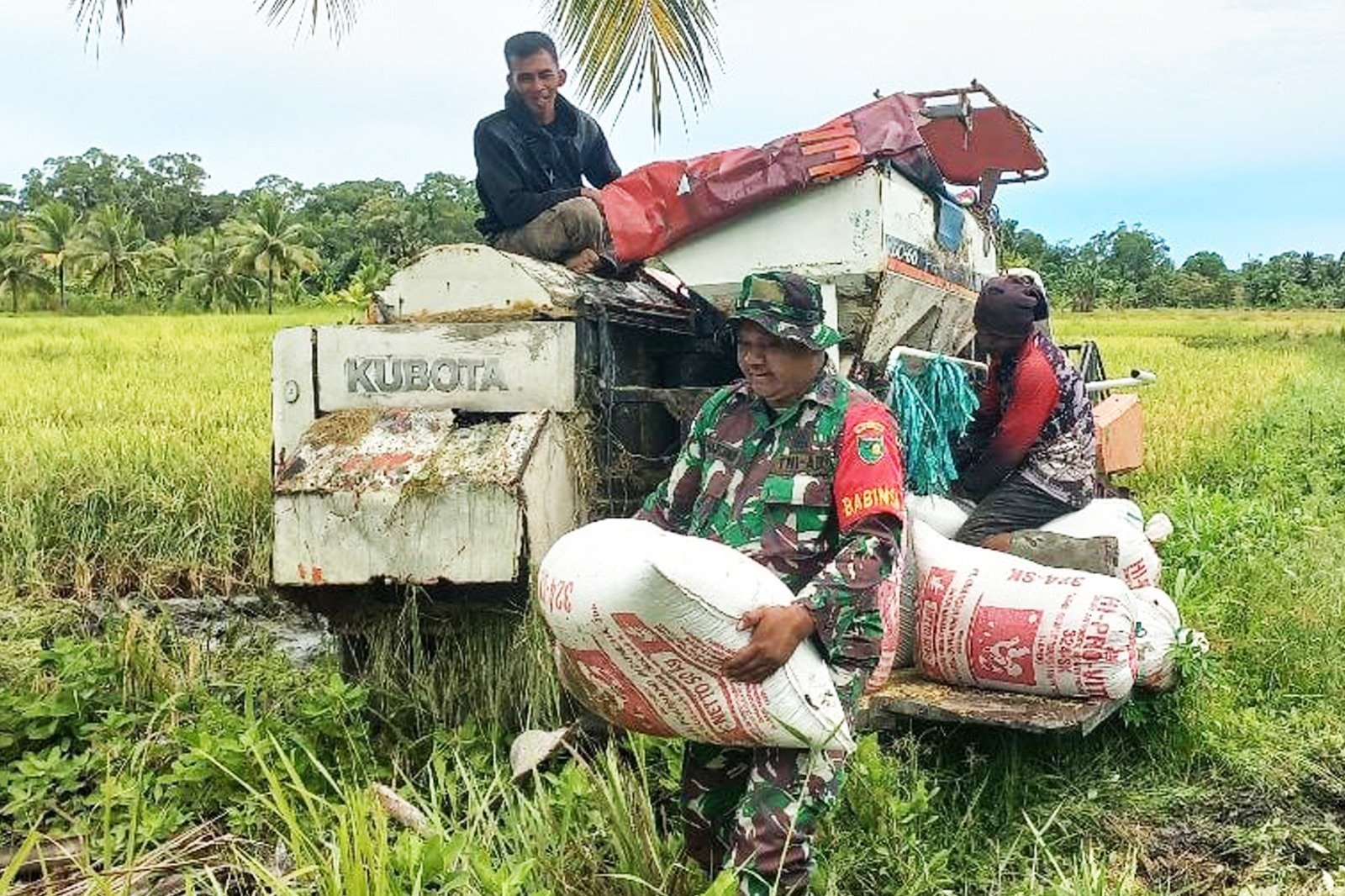 Kali ini Babinsa Koptu Harsono melakukan pendampingan dan membantu keluarga Bapak Irvan salah satu Petani Kampung Onggaya yang sedang memanen padi dilahan sawah miliknya dengan luas 1 Ha”. ucap Danramil Merauke pada hari Kamis tanggal 10 April 2025.
