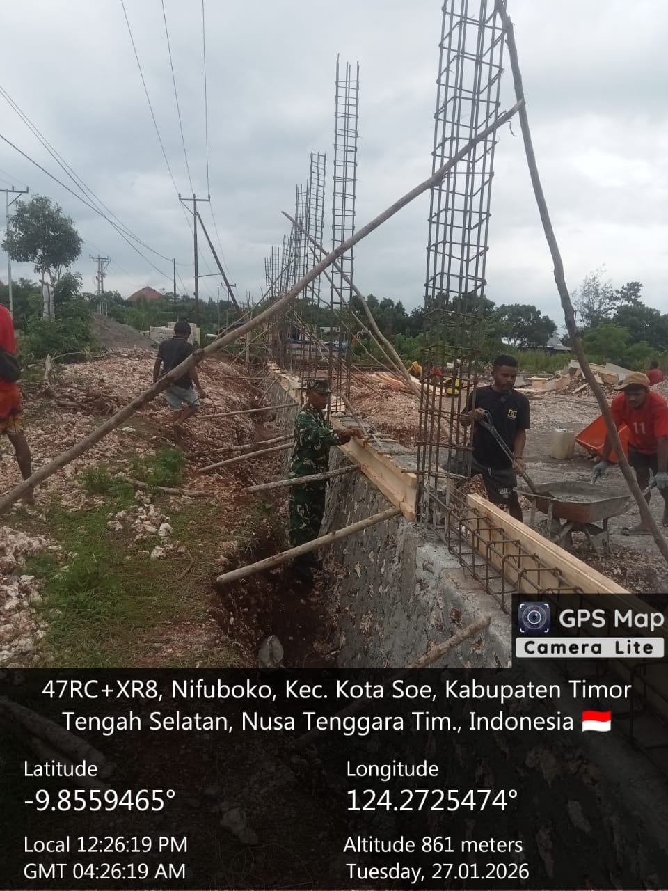 Koramil 1621-01/Kota SoE menunjukkan komitmennya dalam memperkuat pembangunan ekonomi di wilayah binaan melalui pengawasan proyek Gerai KDKMP. Kegiatan ini berlangsung di Kelurahan Karang Siri, Kecamatan Kota SoE, Kabupaten Timor Tengah Selatan, pada Selasa, 27 Januari 2026. Babinsa setempat, Serka Barnabas Mellu, memantau langsung proses pembangunan yang dimulai sekitar pukul 12.39 WITA.