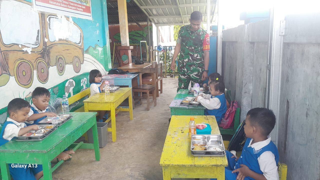 Berlokasi di PAUD KB Melati, Jln. Poros Tonasa 1, Kelurahan Kassi, Kecamatan Balocci, Kabupaten Pangkep, Serda Haerul mendampingi para siswa-siswi dalam menikmati menu sehat yang disiapkan khusus untuk meningkatkan asupan gizi mereka.