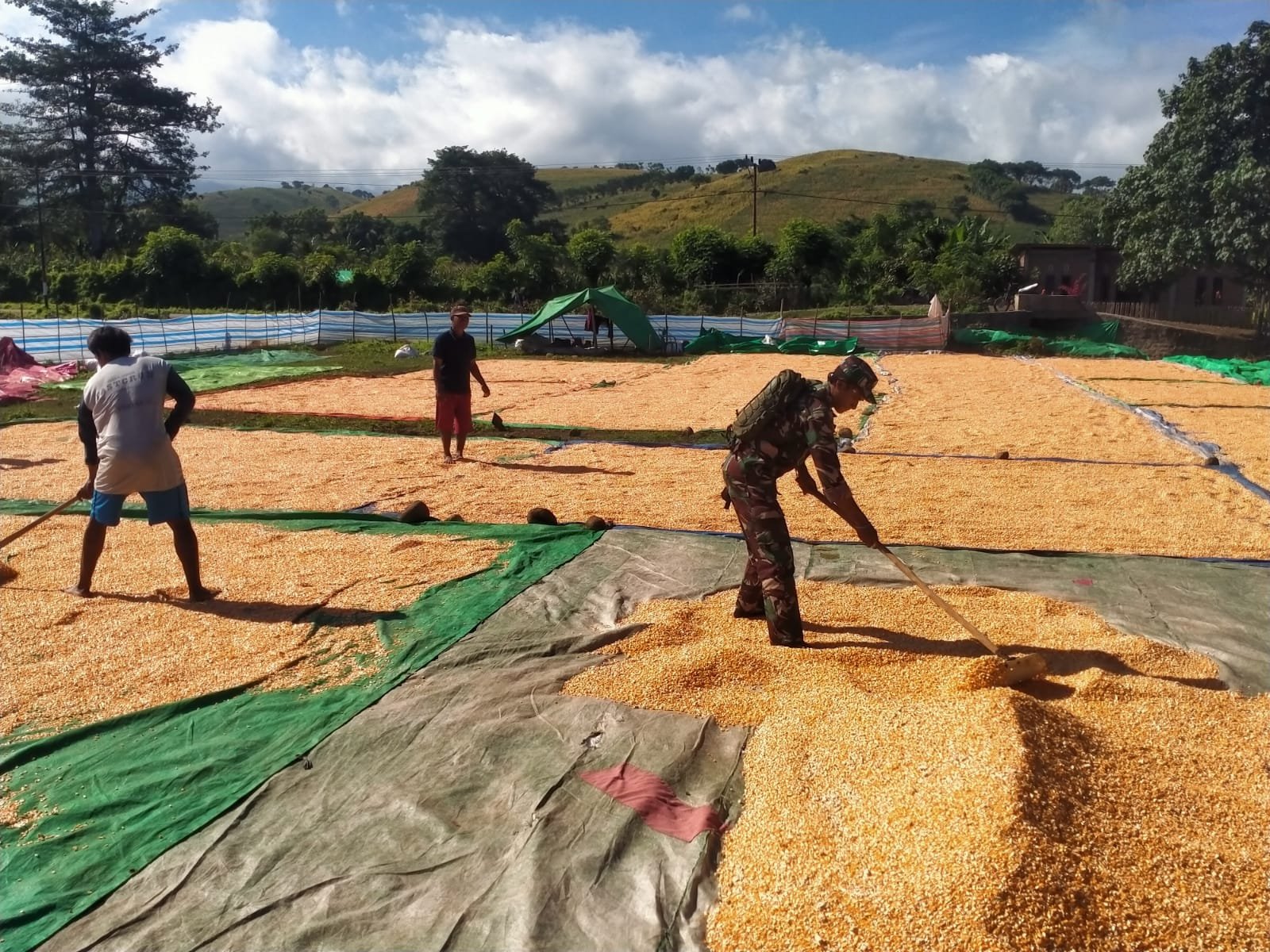 Dalam rangka melaksanakan tugas teritorial, Kopda Daud melakukan komunikasi sosial dengan warga setempat di Dusun Liku. Suasana keakraban sangat terasa saat Babinsa membantu masyarakat menjemur hasil panen jagung.