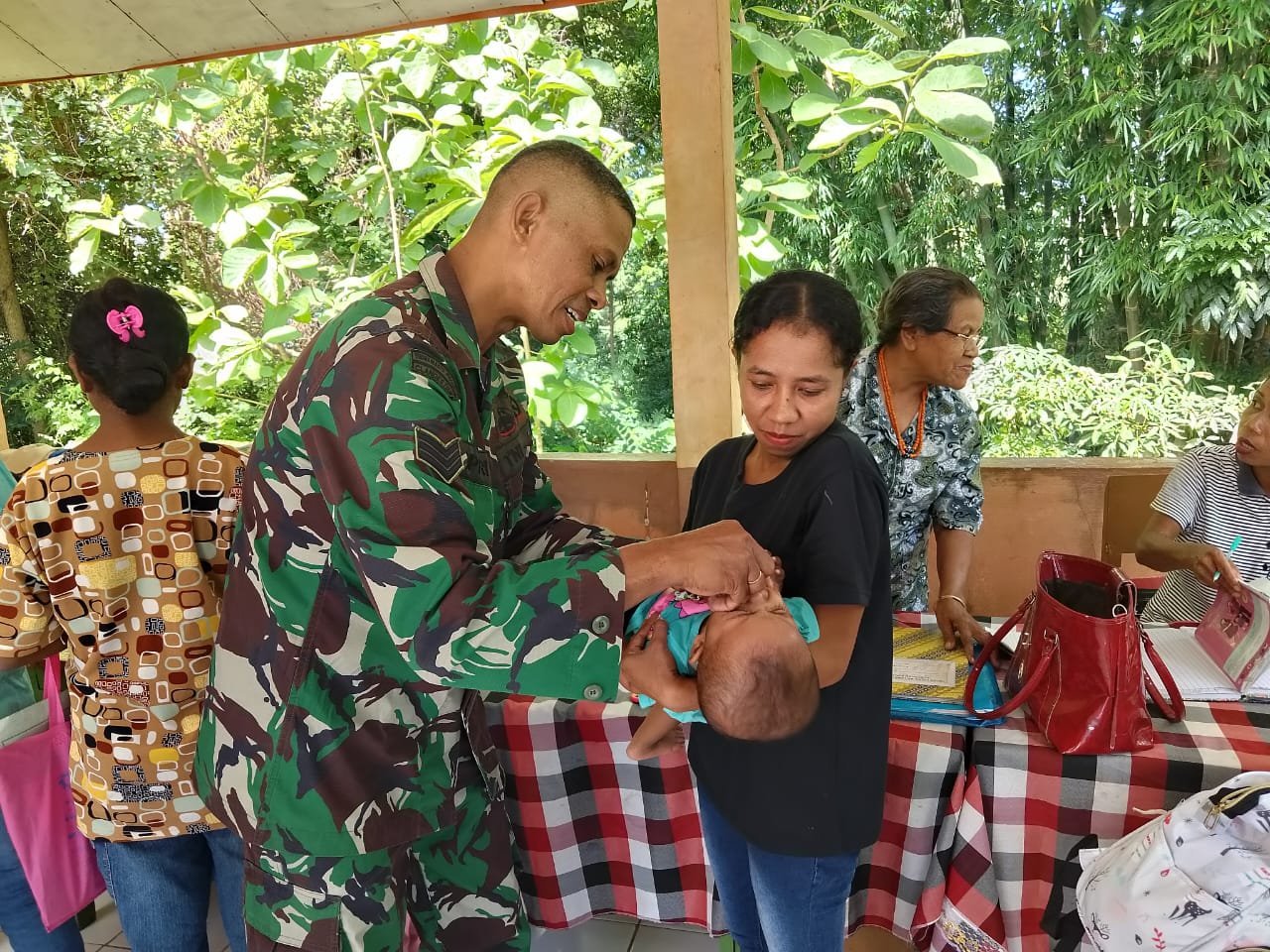 TTS – Babinsa Koramil 03 Mollo Utara Serka Siprianus Nomleni melakukan pendampingan kegiatan penimbangan Balita di Posyandu Mainikin Desa Biloto Kecamatan Mollo Selatan Kabupaten Timor Tengah Selatan