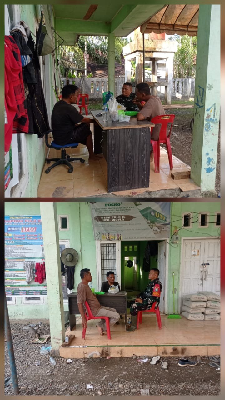 ACEH BARAT – Babinsa Koramil 02/Woyla Kodim 0105/Abar, Sertu M. Andri Seriawan, melaksanakan Komunikasi Sosial (Komsos) bersama warga binaan membahas keamanan lingkungan di Desa Pulo Ie, Kecamatan Woyla, Kabupaten Aceh Barat, Rabu (10/12/2025).