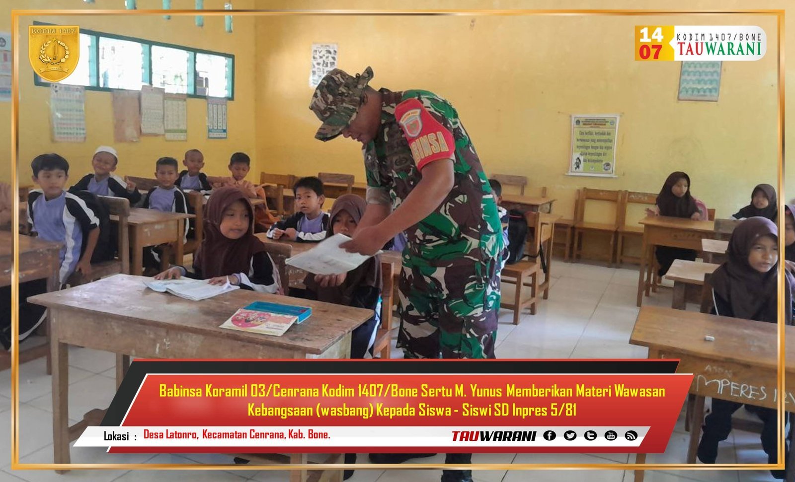 Bone – Dalam rangka menanamkan nilai-nilai kebangsaan sejak dini, Babinsa Koramil 03/Cenrana Kodim 1407/Bone, Sertu M. Yunus, memberikan materi Wawasan Kebangsaan (Wasbang) kepada siswa-siswi SD Inpres 5/81 yang bertempat di Desa Latonro, Kecamatan Cenrana, Kabupaten Bone, pada Selasa (19/12/2024).