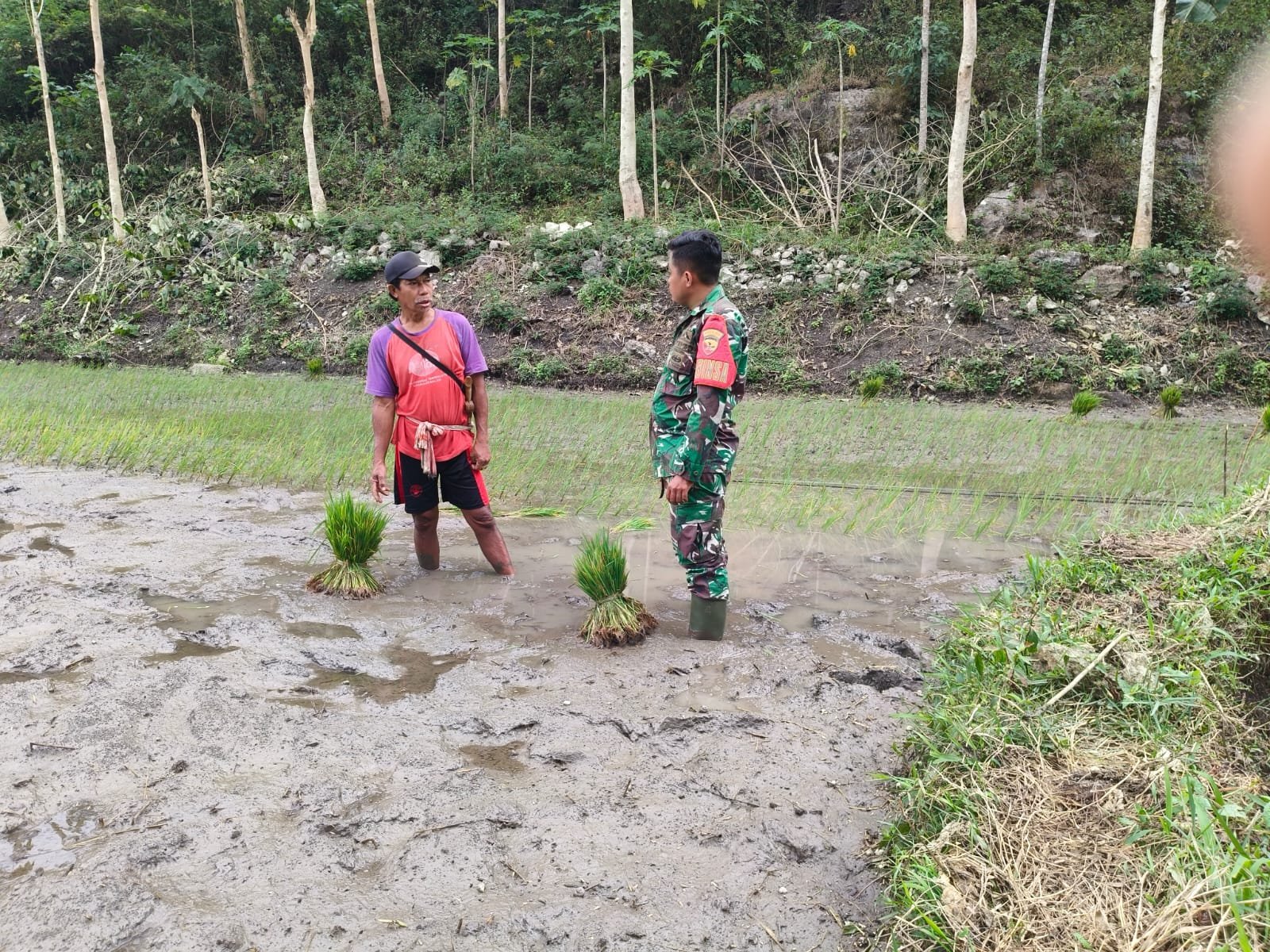Dalam kesempatan tersebut, Kopda Aminullah tidak hanya berbincang dengan para petani, tetapi juga turun langsung membantu proses penanaman padi di sawah.