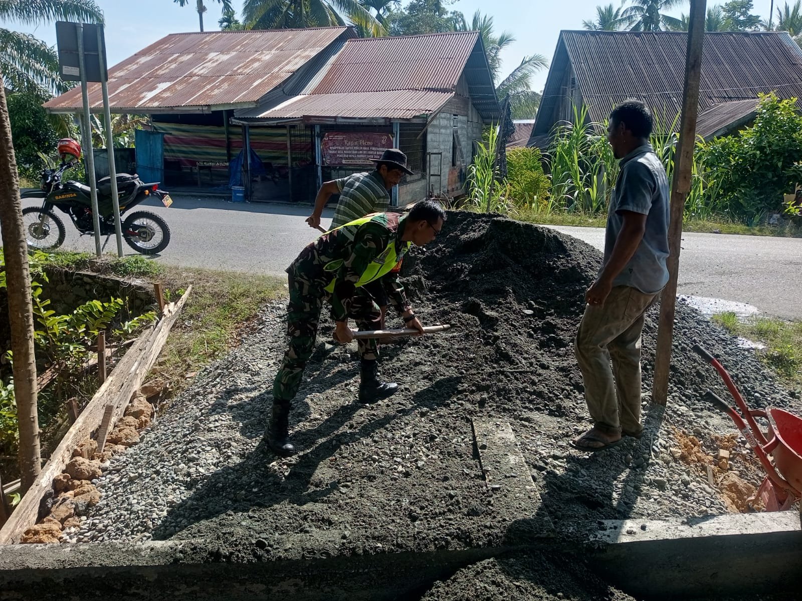 Serda Darma mengatakan, “kebetulan tadi saya sedang berkeliling kampung, dan melihat adanya warga yang sedang menimbun jalan menuju akses rumah warga, saya berhenti dan membantu penimbunan,” kata Serda Darma