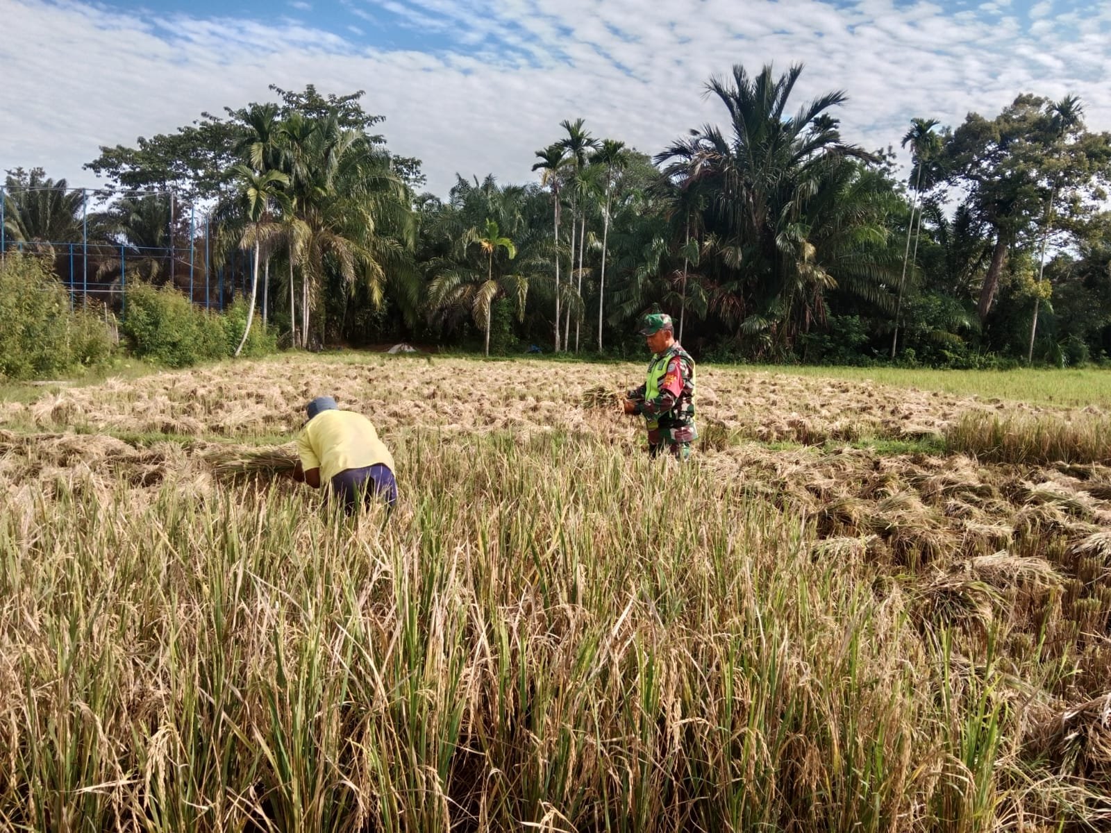 ACEH BARAT – Serka Abdul Talib, Babinsa Koramil 03/Kaway XVI Kodim 0105/Aceh Barat, menunjukkan kepeduliannya dengan terjun langsung membantu warga panen padi di Desa Muko, Kecamatan Kaway XVI, Kabupaten Aceh Barat, Selasa (14/10/2025).