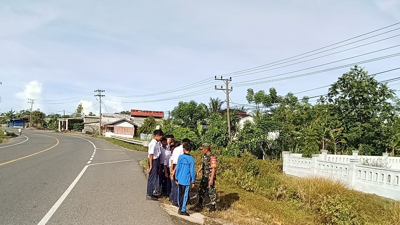 ACEH JAYA – Babinsa Koramil 03/Setia Bakti Kodim 0114/Aceh Jaya, Sertu Marwansyah, melaksanakan kegiatan pembinaan di lingkungan sekolah dengan membantu siswa menyeberang jalan serta memberikan sosialisasi tentang bahaya perundungan di SMP Negeri 4 Setia Bakti, Desa Lhoktimon, Kecamatan Setia Bakti, Selasa (31/3/2026).
