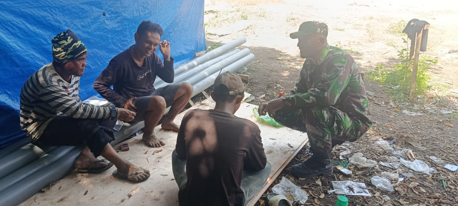 ACEH JAYA – Babinsa Koramil 03/Setia Bakti Kodim 0114/Aceh Jaya, Sertu Ferial Suzanto, melaksanakan komunikasi sosial dengan sejumlah pekerja bangunan yang berasal dari luar Aceh di Desa Sawang, Kecamatan Setia Bakti, Kabupaten Aceh Jaya, Selasa (10/03/2026).