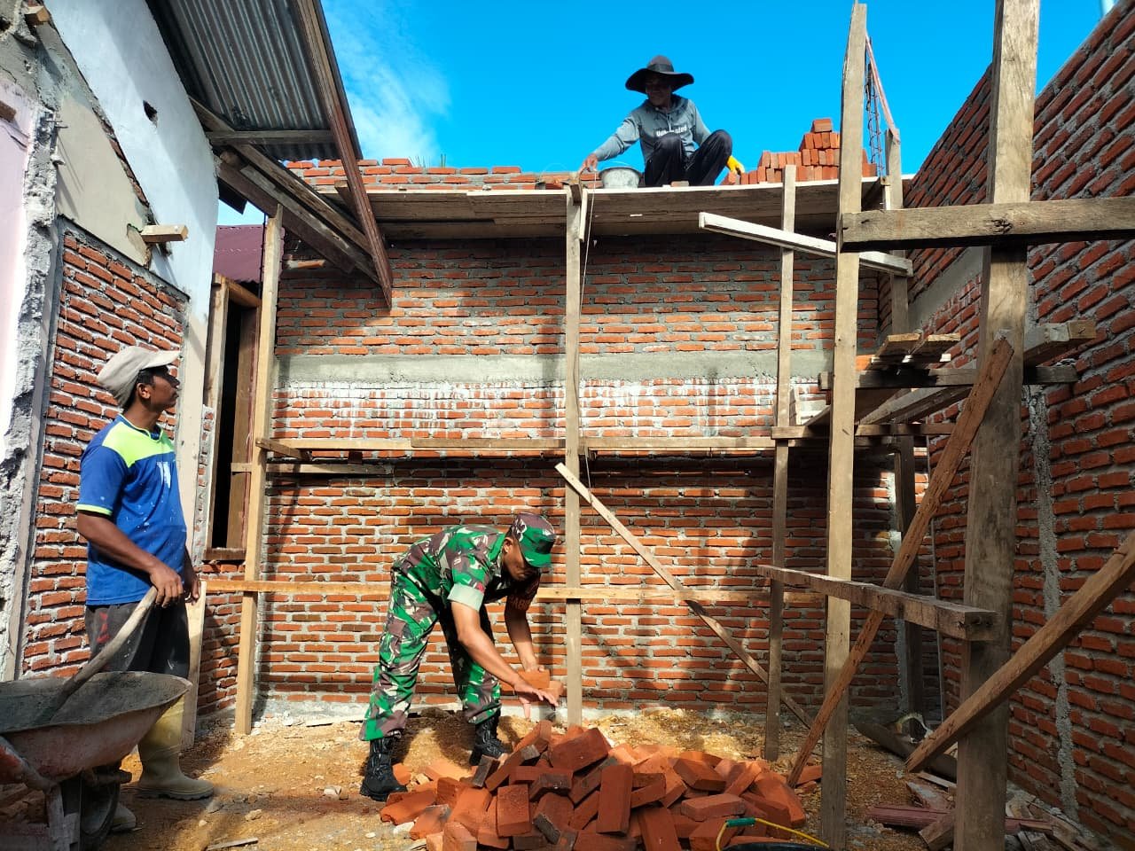 Dalam kegiatan karya bakti tersebut, Koptu Izrillah secara langsung juga membantu mengangkat bata, salah satu material penting dalam pembangunan rumah. Kehadirannya di lokasi pembangunan dapur rumah warga menunjukkan kepedulian dan keseriusan Babinsa dalam terjalinnya hubungan yang harmonis dengan masyarakat di desa binaannya.