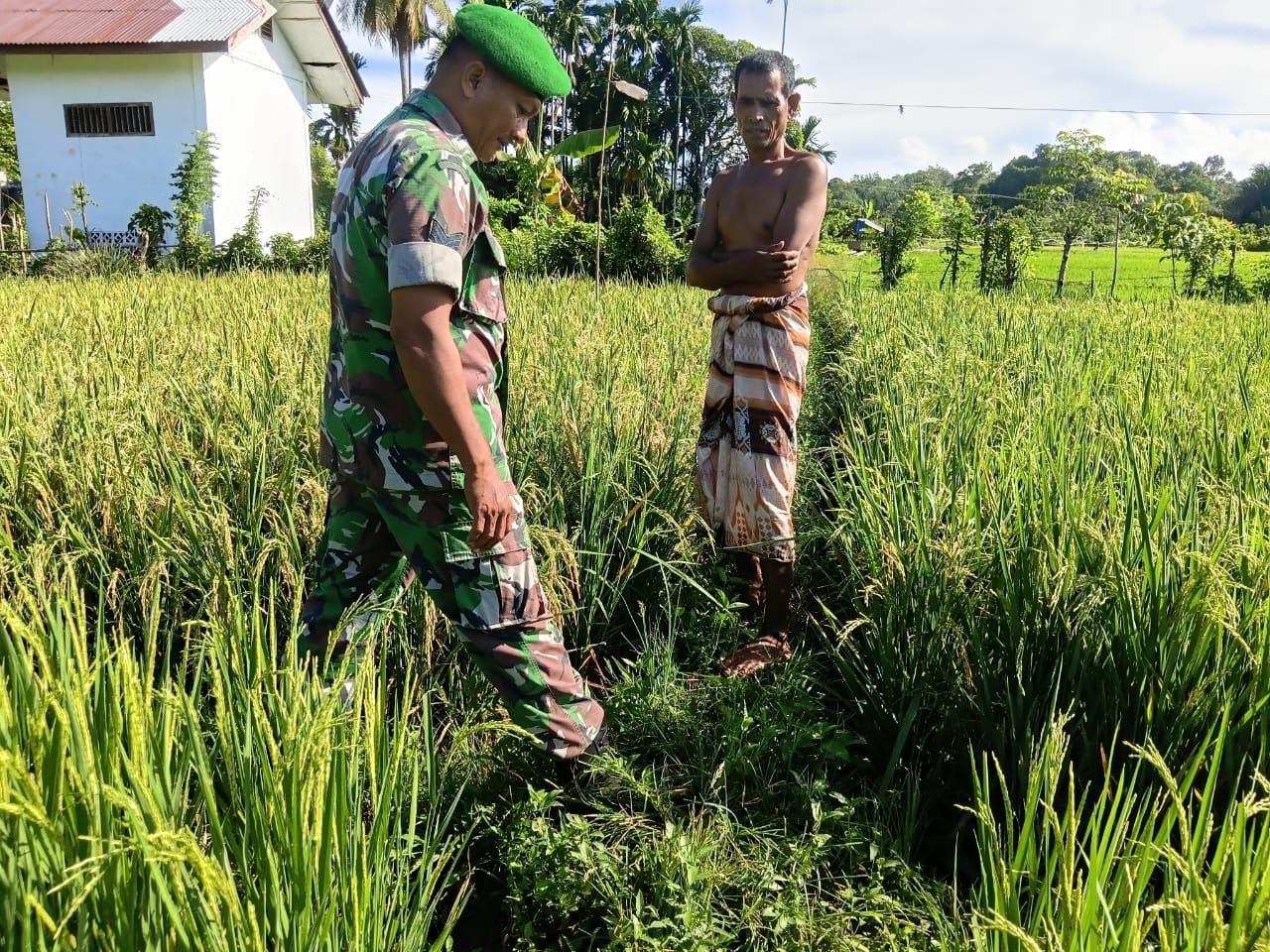 Selain memantau kondisi tanaman, Serka Faisal juga berdiskusi dengan petani mengenai kondisi lahan, ketersediaan air, serta perkembangan tanaman padi yang saat ini sedang tumbuh. Informasi tersebut sangat penting untuk mengetahui sejauh mana kondisi pertanian di wilayah tersebut.