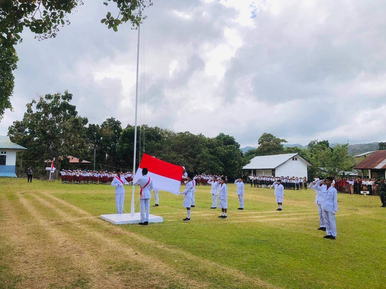 NTT-Sumba Timur,Dalam rangka memperingati Hari Ulang Tahun Kemerdekaan Republik Indonesia ke-80, Babinsa Koramil 06/Karera Kodim 1601/Sumba Timur yang terdiri dari Serka Dominggus Lay, Sertu Junus Ratu, dan Pratu Hesron Domu Wora menghadiri dan mendampingi pelaksanaan Upacara 17 Agustus yang digelar di Lapangan Upacara Kecamatan Ngadu Ngala, Kabupaten Sumba Timur,pada hari Minggu (17/08/2025).