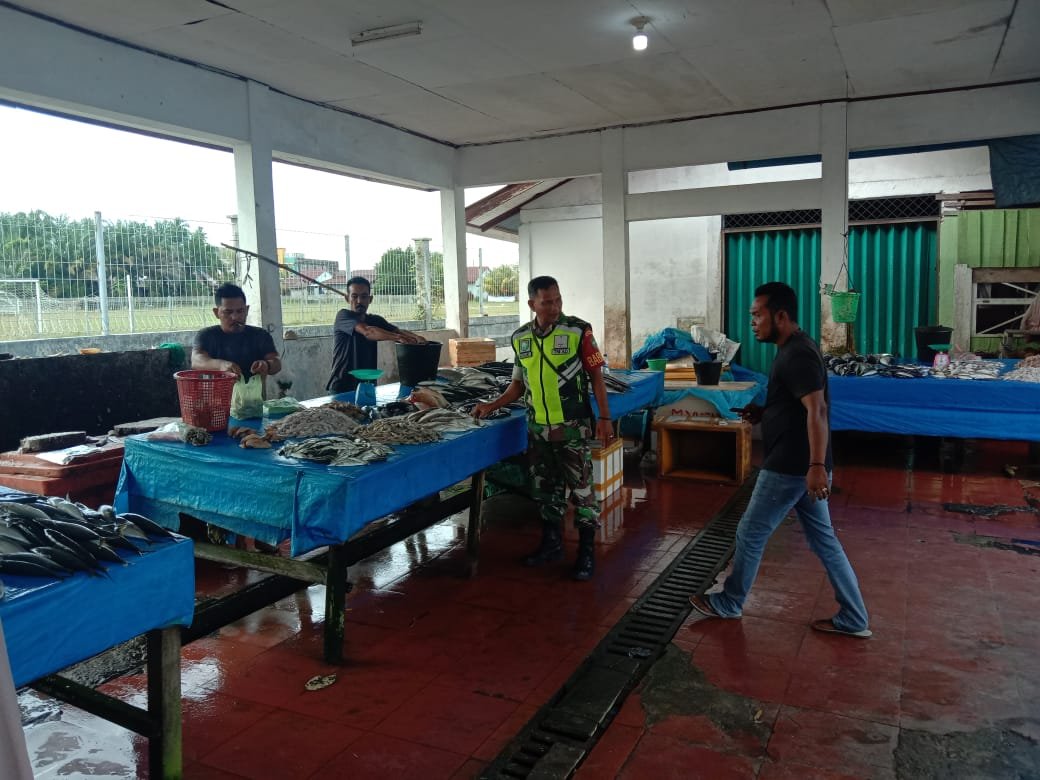 ACEH JAYA – Babinsa Koramil 06/Teunom Kodim 0114/Aceh Jaya Serka Muhammad Daud melaksanakan kegiatan Komunikasi Sosial (Komsos) bersama Mukhlis (53), seorang pedagang ikan di Pasar Kude, Desa Kude, Kecamatan Teunom, Kabupaten Aceh Jaya, Rabu (22/10).