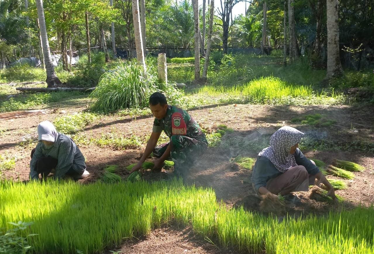ACEH BARAT – Babinsa Koramil 08 Arongan Lambalek, Kodim 0105/Aceh Barat, Sertu Agus S terjun langsung membantu proses pencabutan benih padi yang akan ditanam di lahan sawah milik warga Desa Ujung Beusa, Kecamatan Arongan Lambalek, Kabupaten Aceh Barat. Sabtu (25/01)