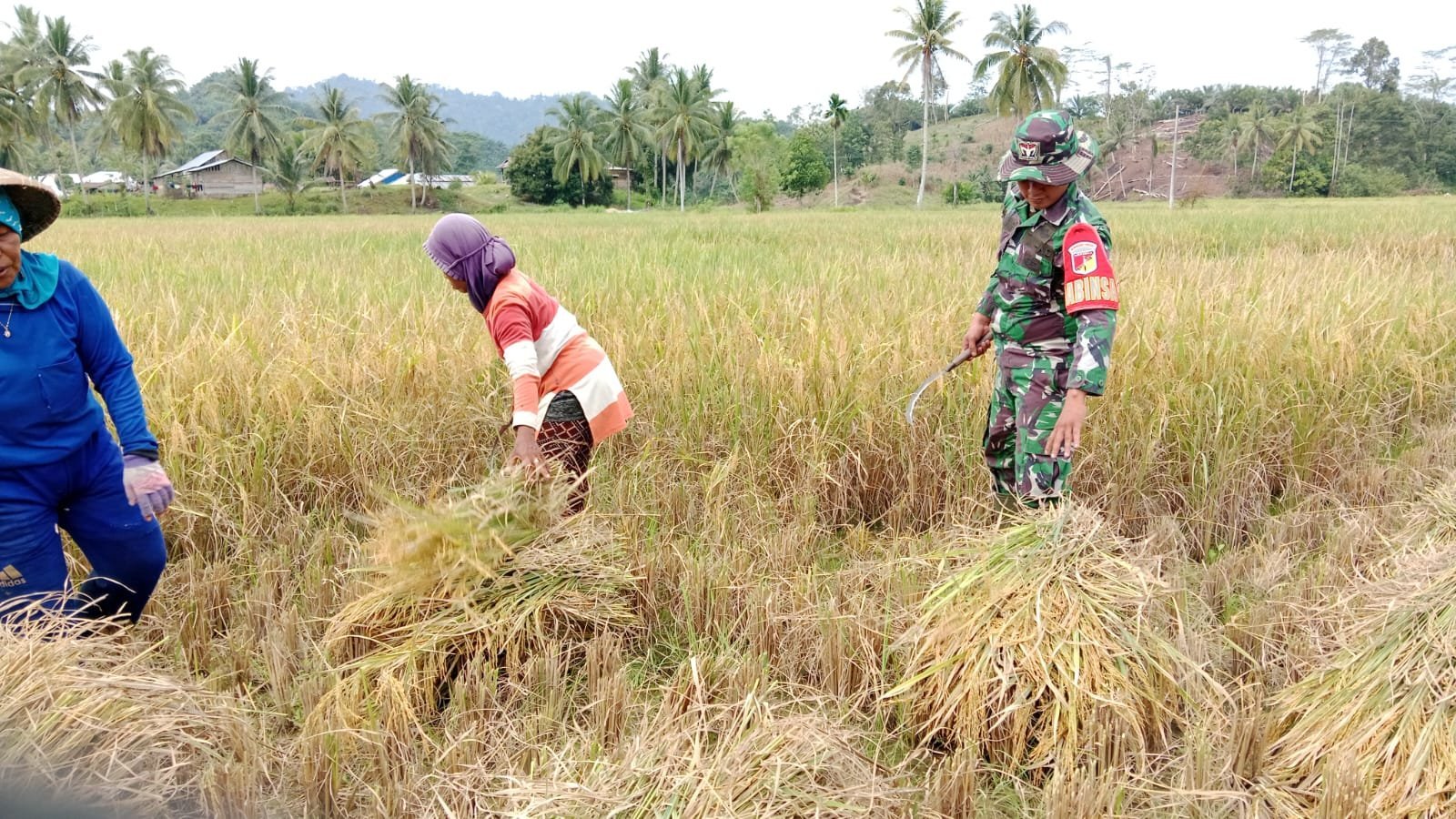 Buol – Babinsa Koramil 1305-09/Bokat Pratu Rustam melaksanakan kegiatan pendampingan Hanpangan membantu panen padi jenis wangi di sawah seluas 1 Ha, milik ibu Sulastri, yang berasa di Desa Bukal, Kec. Bukal, Kab. Buol. Jumat (10/1/25)