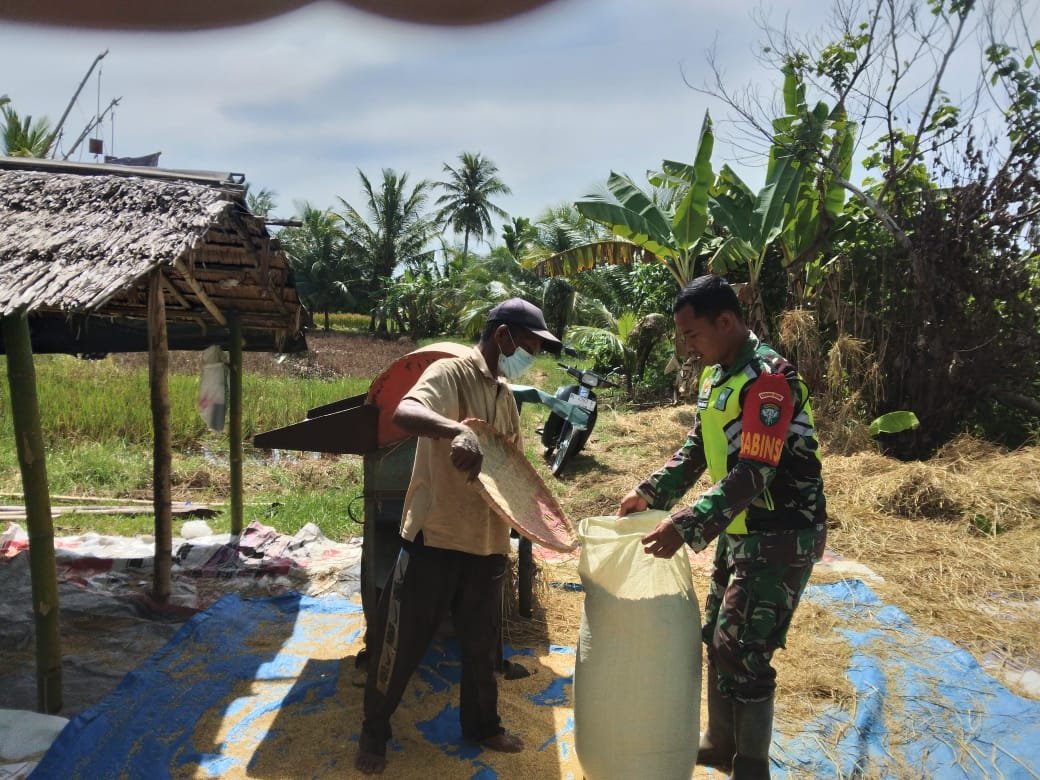 Mengenakan seragam dinas dan penuh semangat, Kopda Hendrawan bekerja bersama warga di atas terpal biru yang membentang di tengah ladang. Ia turut membantu menuangkan hasil panen ke dalam karung, mendampingi proses perontokan menggunakan mesin sederhana, sekaligus memastikan kualitas gabah tetap terjaga.