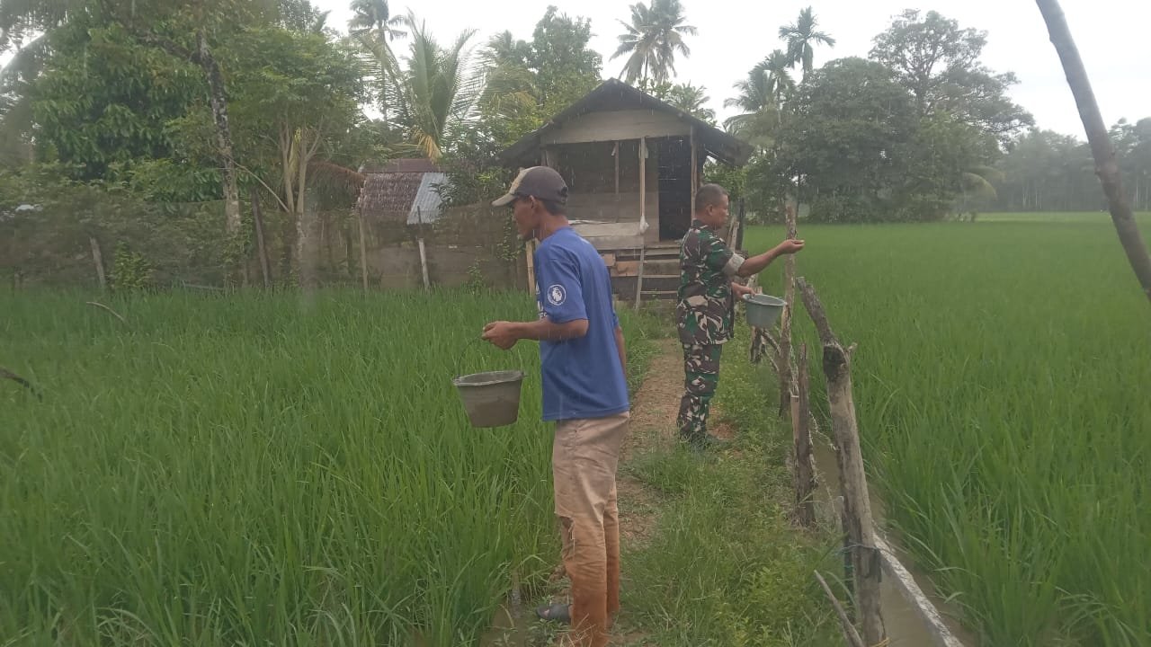 ACEH BARAT — Dalam upaya memperkuat ketahanan pangan dan mendukung kesejahteraan petani, Serda Heru Santoso, Babinsa Koramil 09/Samatiga, terjun langsung ke lahan persawahan bersama Kelompok Tani (Pok Tani) Desa Leubok untuk melakukan kegiatan pemupukan padi. Kegiatan ini menjadi bagian dari komitmen TNI dalam mendampingi masyarakat secara aktif di sektor pertanian. Minggu (3/8/2025)
