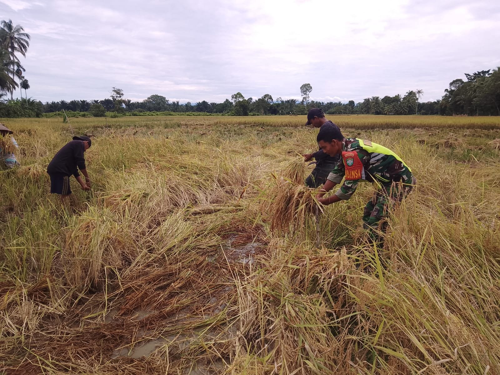 Dengan latar belakang langit mendung dan barisan pohon yang membingkai sawah, momen kebersamaan antara Babinsa dan para petani ini menjadi potret indah semangat gotong royong dan solidaritas di pedesaan. Panen padi bukan hanya tentang hasil, tetapi juga tentang harapan, kerja sama, dan komitmen untuk membangun negeri dari akar rumput.