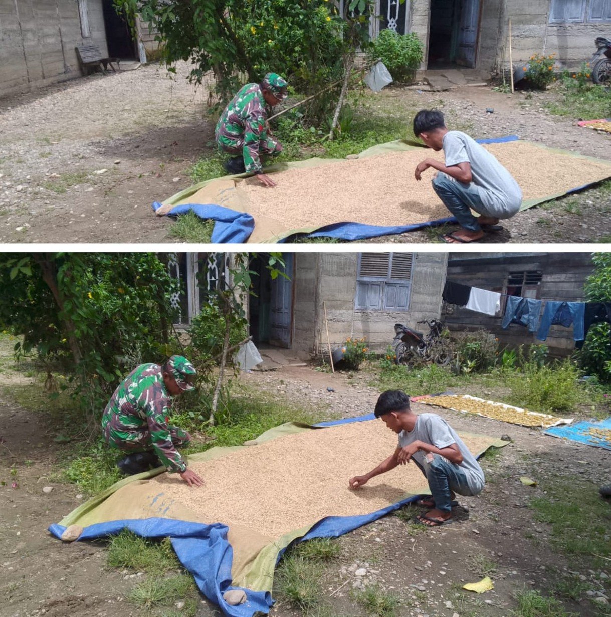 Kegiatan tersebut dilakukan bersama Bapak Zulkifli, salah satu petani setempat, yang tengah menjemur bibit padi sebagai persiapan untuk musim tanam berikutnya. Kehadiran Babinsa di tengah-tengah masyarakat menjadi motivasi tersendiri bagi para petani dalam meningkatkan produktivitas pertanian.