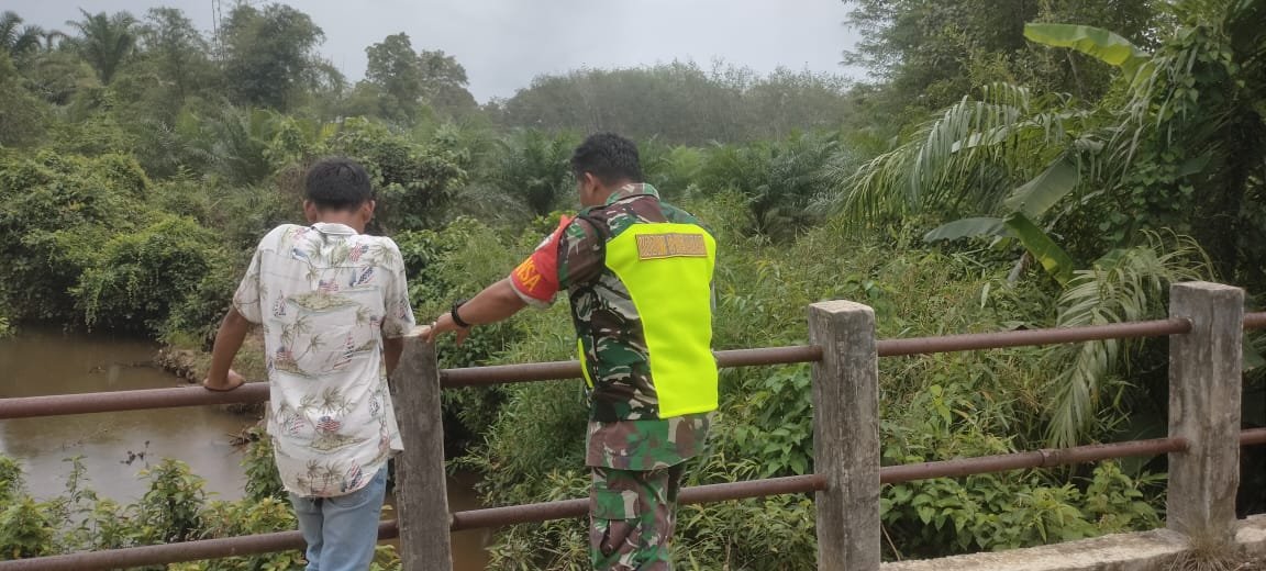 ACEH BARAT – kepedulian ditunjukkan personil Babinsa Koramil 11/WT Kodim 0105/Abar Koptu Caniago dan warga Paya Baro Kecamatan Woyla Timur cek kondisi aliran sungai Woyla. Senin (07/07/2025).