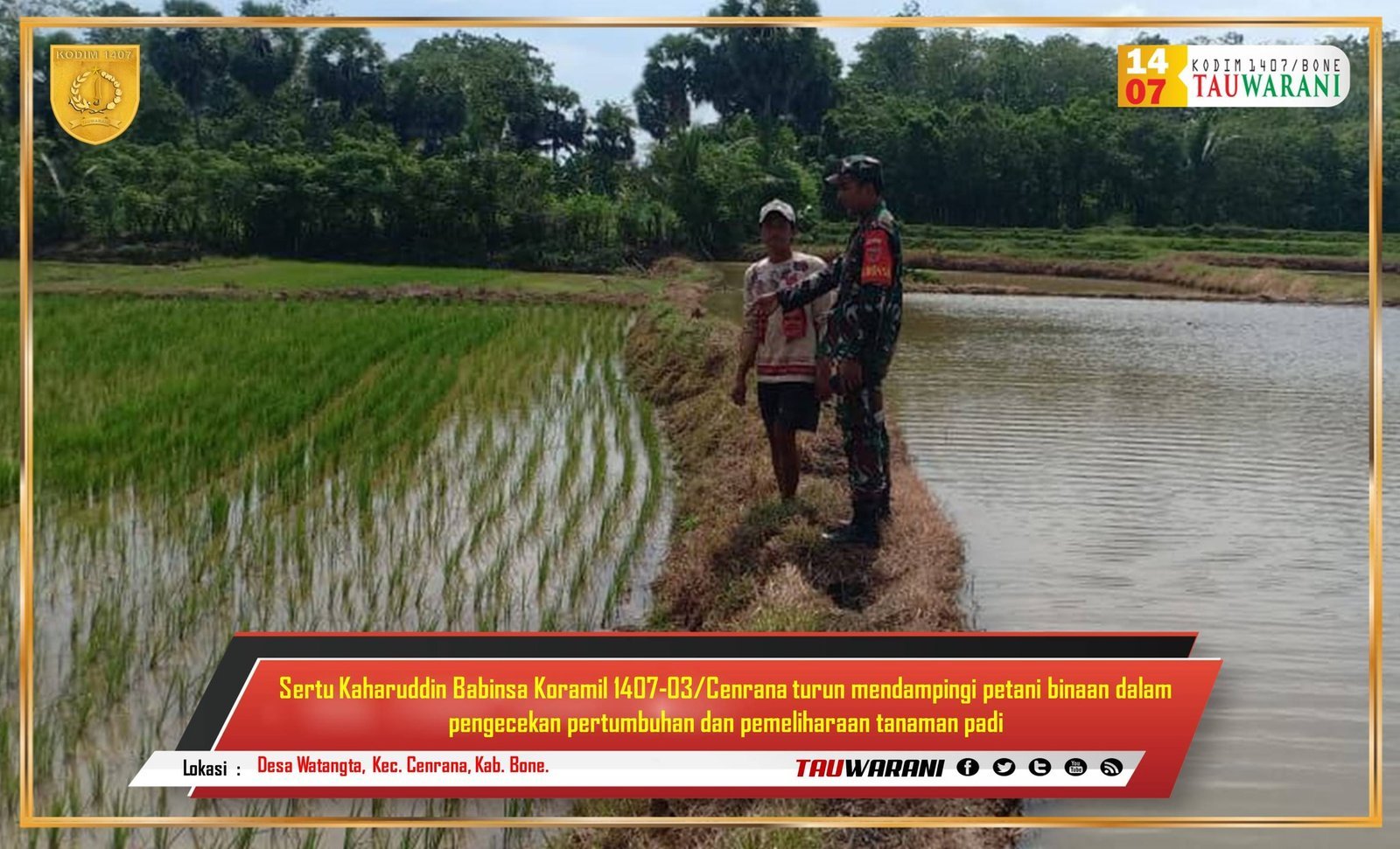 Bone – Dalam upaya mendukung ketahanan pangan, Babinsa Koramil 1407-03/Cenrana, Sertu Kaharuddin, turun langsung ke sawah mendampingi petani binaannya dalam pengecekan pertumbuhan dan pemeliharaan tanaman padi di Desa Watangta, Kecamatan Cenrana, Kabupaten Bone.