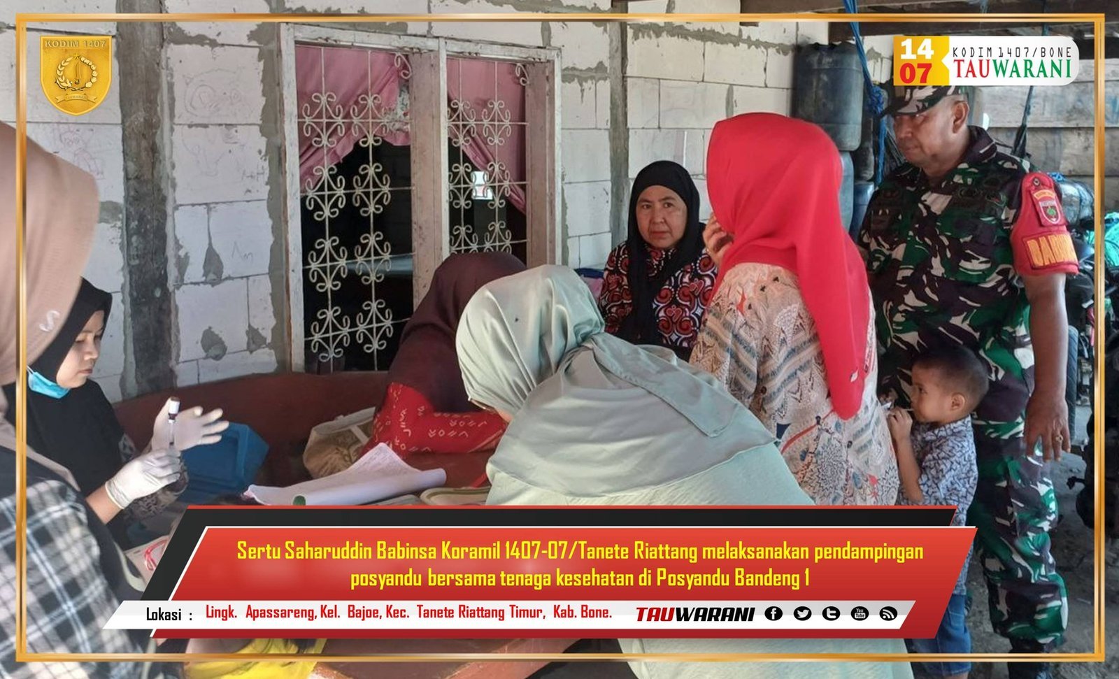 Bone, – Babinsa Koramil 1407-07/Tanete Riattang, Sertu Saharuddin, melaksanakan pendampingan dalam kegiatan Posyandu Bandeng 1 di Lingkungan Apassareng, Kelurahan Bajoe, Kecamatan Tanete Riattang Timur, Kabupaten Bone, Rabu (18/12/2024).