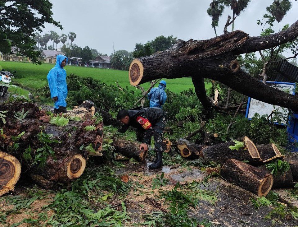 Gowa – Hujan deras yang disertai angin kencang terjadi di wilayah Kecamatan Barombong yang mengakibatkan pohon tumbang dan menutup akses jalan yang mengahalangi jalan poros yang menghubungkan Desa Tinggimae kec. Barombong Kab. Gowa Ke desa Pakkabba Kec. Galesong Utara Kab. Takalar Selasa (11/02/2025).